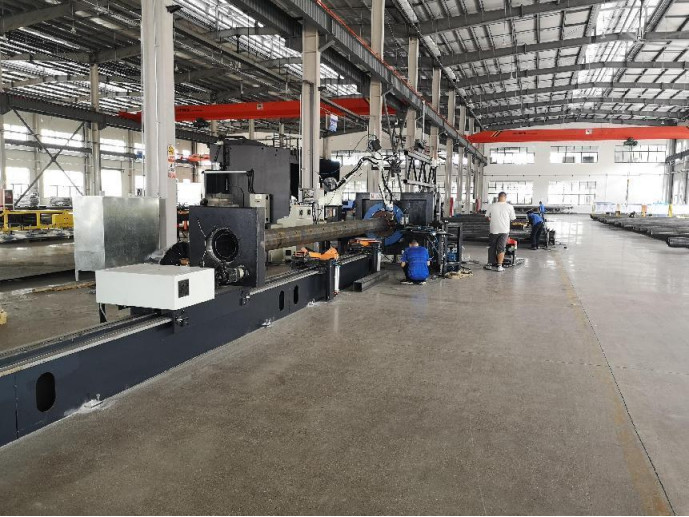 ประการแรก รอยตะเข็บเส้นรอบวงด้านในและด้านนอกของแผ่นฐานเสาจะถูกเชื่อม จากนั้นจึงเชื่อมซี่โครงเสริมของแผ่นฐานโดยอัตโนมัติ